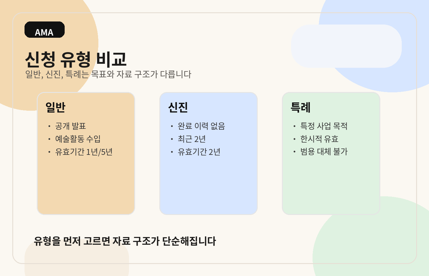 예술활동증명에서 유형 선택은 가장 앞단의 결정입니다. 이 단계가 틀리면 자료를 많이 모아도 기준을 맞추지 못하거나, 더 쉬운 경로를 두고 돌아가게 됩니다.